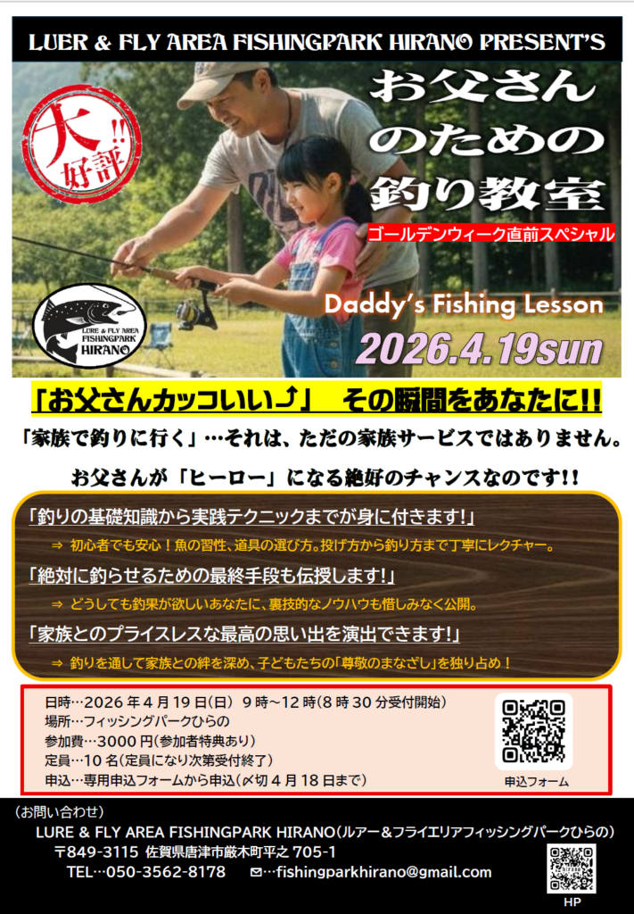今回は、「ゴールデンウィーク直前企画」として、大型連休中にファミリーフィッシングを計画しているお父さん達に贈る「絶対にハズさない釣りをするためのノウハウ」を学べる場や機会を提供するイベントを開催します。そして、「『お父さんカッコいい⤴』その瞬間をあなたに!!」のキャッチコピー通りに、子どもからの尊敬のまなざしを独り占めできる釣りを成立させるための秘密を公開いたします。フィッシングパークひらのは、お父さんが輝く瞬間を全力でサポートし、家族でのプライスレスな時間を演出します。ご家族には内緒で、こっそり学びに来てください。