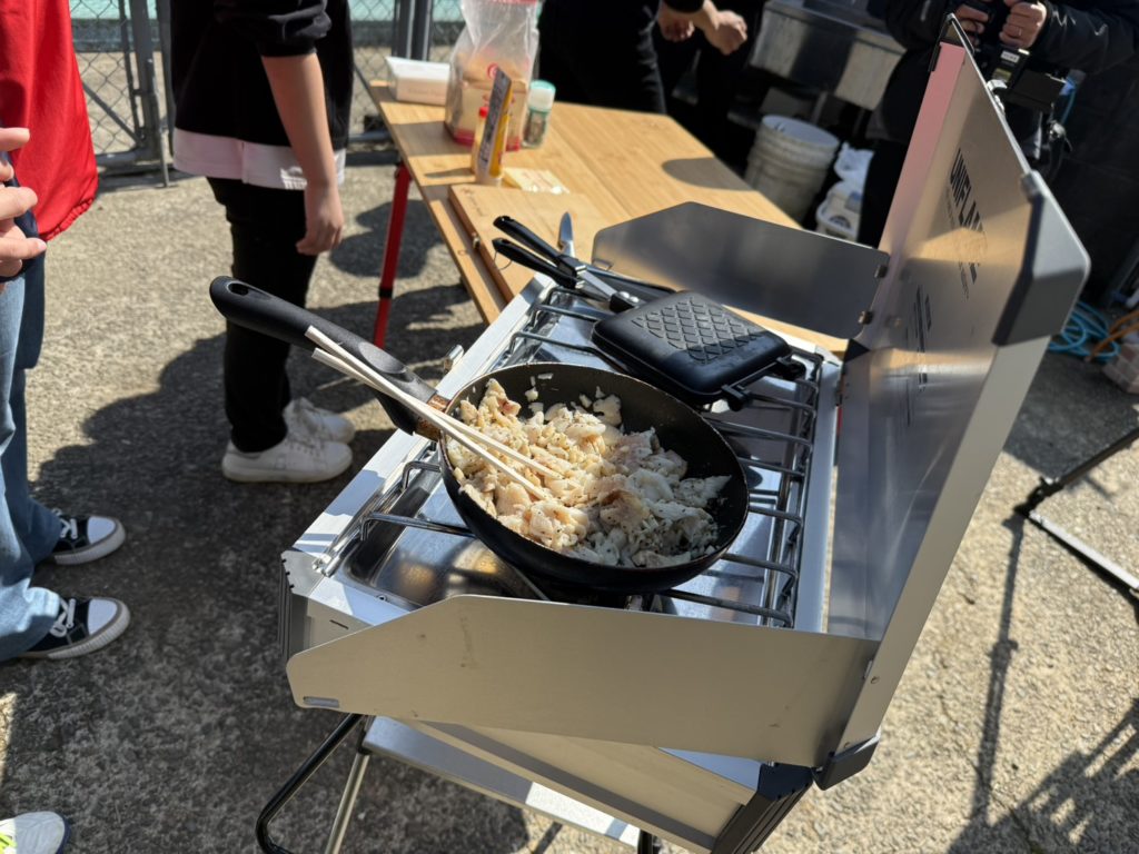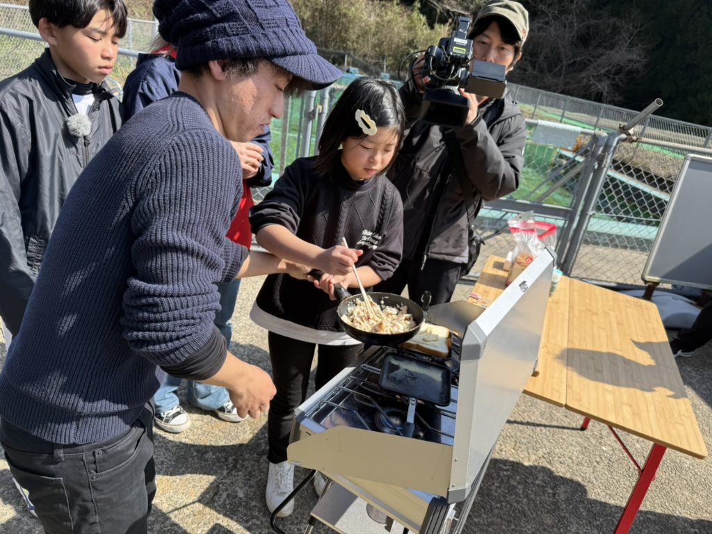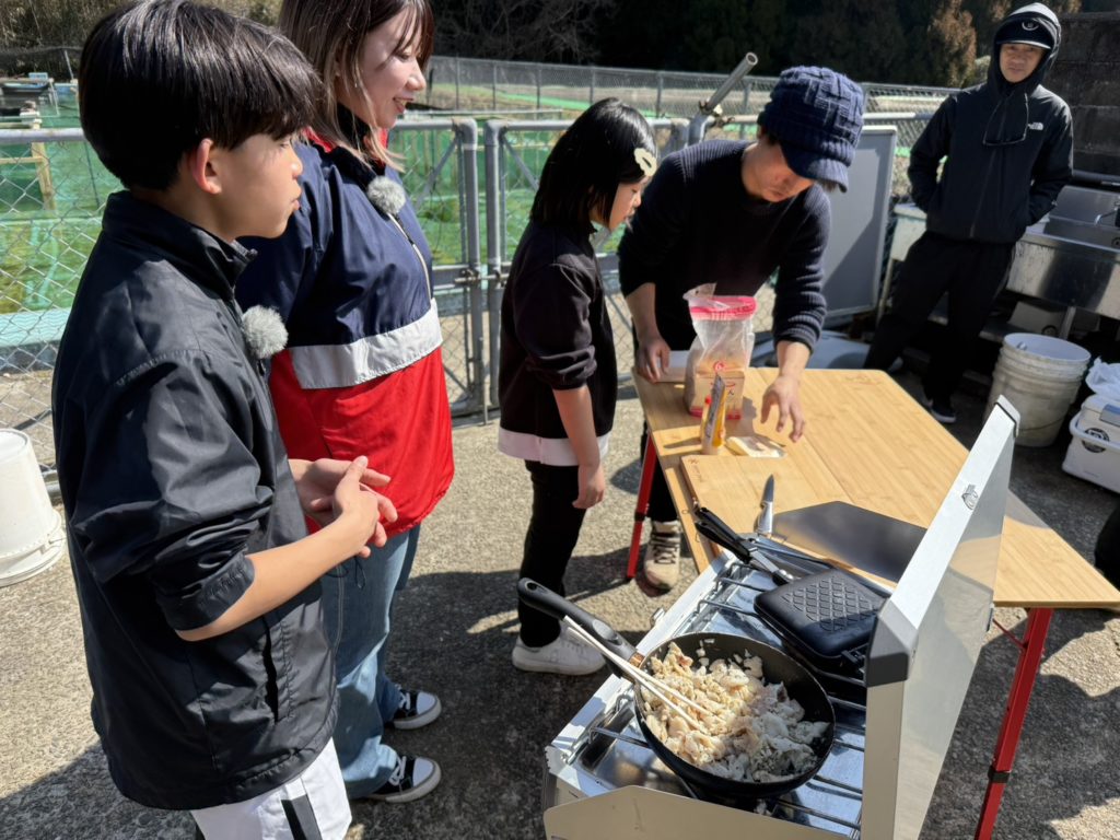 皆さん無事にニジマスをキャッチすることができました。釣りを楽しんだ後は、いよいよ釣ったニジマスを使った料理を作ります。今回は、調理師免許を持っている横田店長がメニュー・レシピ作りから調理指導までを行い、小林ファミリーに自分たちでアウトドアクッキングをしてもらいました。