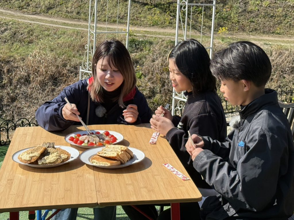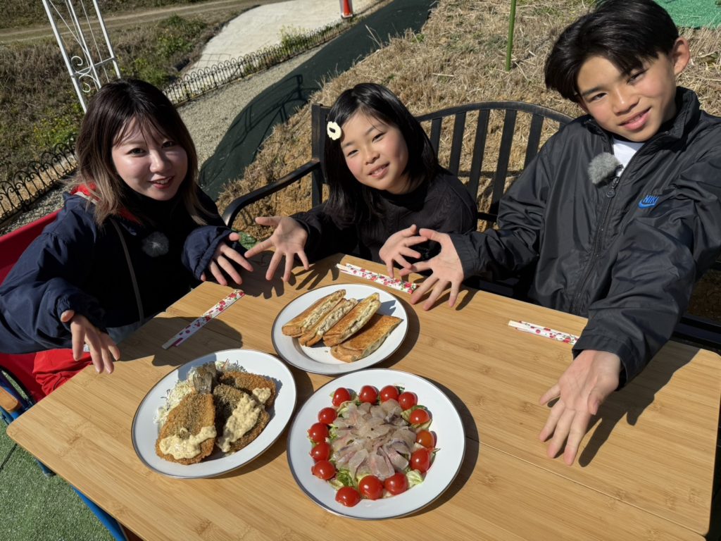 家族で協力して、ついに料理が完成しました。本日のメニューは、「ニジマスホットサンド」と「ニジマスフライタルタルソース」、「ニジマスのカルパッチョ」の3品です。これはガチで美味いやつです。そして、「釣った魚をその場で調理して食べる」なんて、まさに「釣ってくう」というタイトルにドンピシャですね。