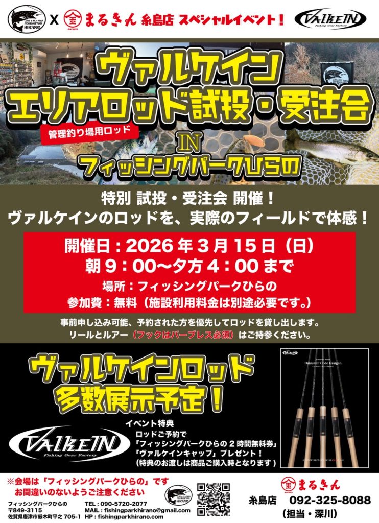 2026年3月15日(日)に釣り具のまるきん糸島店様主催のヴァルケインロッドの試投・受注会を開催いたします。