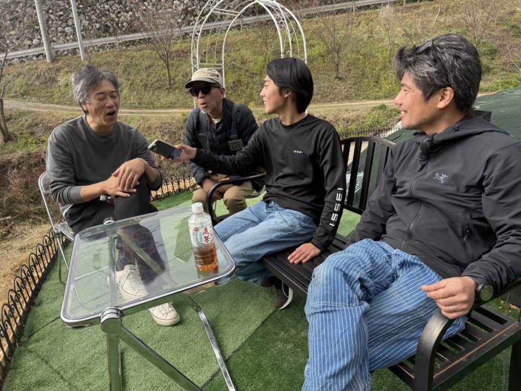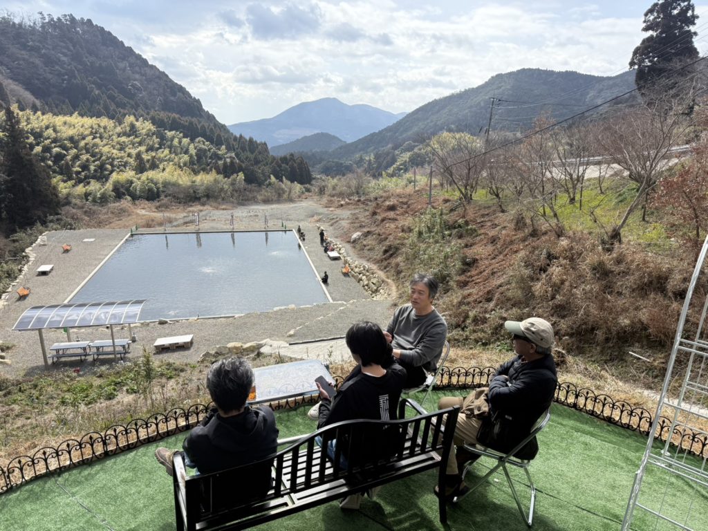 早速、昨日の「ひらのフライキャストクリニック」の参加者の皆さんに、「ひらの展望台」で昼食をとっていただきました。第2ポンドを見下ろし、その向こうに広がる山間の自然豊かな景色を眺めながらついつい話が弾みます。