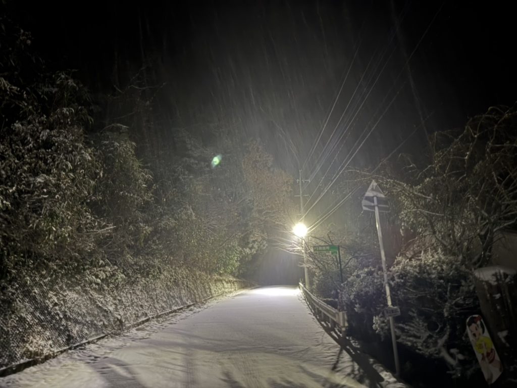 天気予報では、今朝から唐津市に雪が降る予報になっていました。現在、雪が降っており道路に積雪があります。