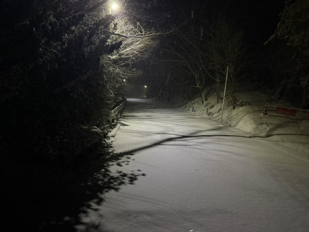 ノーマルタイヤで雪山を登ってくるのは大変危険です。雪用タイヤ及びチェーンが必要です。くれぐれも安全運転を第一とした行動をお願いいたします。この状況では、除雪車も来ると思います。雪や道路の状況については、HPやSNSで随時お知らせいたしますので、ご確認ください。